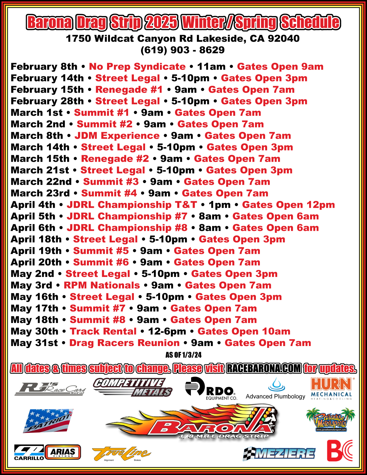 <https://www.brattland.org/current-event-calendar/> https://www.brattland.org/current-event-calendar/ SAN DIEGO CAR GUYS (SDCGs) EVENT CALENDAR WEEK OF 10/19/2025 <https://www.brattland.org/vehicles-for-sale/> Cars for Sale on SDCarGuys <https://www.facebook.com/marketplace/item/1954325141978256> 1929 Ford Model A Roaster <https://www.brattland.org/1974-chevrolet-corvette-stingray-for-sale/> 1974 Chevrolet Corvette Stingray <mailto:sandiegocarguys@brattland.org> sandiegocarguys@brattland.org To sign up for the SDCGs Email list, go to: <https://www.brattland.org/mailman/listinfo/sandiegocarguys> https://www.brattland.org/mailman/listinfo/sandiegocarguys Recommended 1932-1979 Ford Parts <http://www.cgfordparts.com> www.cgfordparts.com Dorothy Bangiola C&G Ford Parts 1941 Commercial St. Escondido CA 92029 760-740-2400 <http://www.cgfordparts.com> www.cgfordparts.com Send your calendar updates for the SDCGs Events Calendar to <mailto:mgbrattland@gerlecreek.com> mgbrattland@gerlecreek.com Wordpress Website Creation, Management, Email, etc. $35 per hour, <mailto:mgbrattland@gerlecreek.com> Mike Brattland 619 454-0496 10/22 Every Wednesday Wednesday Breakfast Group, El Cajon, 8 am Bonnys Café 596 Broadway gotta drive em 10/22 Every Wednesday until October 22, 2025 El Cajon Classic Cruise 5pm-7:30pm, Main & Magnolia - Downtown El Cajon (Address for GPS is 200 E Main St. El Cajon 92020), Info: 619-201-8207 10/23 Every Thursday La Mesa Car Show-Cruzin La Mesa Starts June 2025 till Fall 2025 10/24 Every Friday Cruin Grand in Escondido, 2025 Season, begins June 20th, ends in Fall 2025 10/24 Every Friday <https://www.goodoleboyssandiego.com/wp-content/uploads/2022/10/IMG_1714-sca led.jpg> Cars on Main Street Off Season Shows, In front of American Retro 245 E. Main St. El Cajon, Car Gathering, Bring your chairs. Free to all makes & Models, Park, Cars Eat, Talk Friday Nights Start 3PM, Sun Mornings, Start 7am November thru June Gotta drive em 11/1 First Saturday In-n-Out Burger, Poway, 1030AM to 1:00PM Poway Cruisers Cruise In Off Scripps Poway Pkwy & Community Rd, 12890 Gregg Ct All makes, models, years and everyone welcome Info: Shawn Hodgetts <mailto:shodgetts@cox.net> shodgetts@cox.net gotta drive em 10/25 Fourth Saturday Cars & Coffee Event, El Cajon, 8:30am Foothills Church 365 W. Bradley Ave. gotta drive em 10/25 Every Saturday Donut Derelicts, Huntington Beach, 6:30am Adams Ave. Donuts @ Magnolia Info <mailto:info@rodshows.com> info@rodshows.com gotta drive em 10/25 Every Saturday Rods & Relics, Bonsal, 7am Z Café Hwy 76 & Mission Road gotta drive em 10/25 Every Saturday Dunkers & Clunkers, Bonita, 7am Bonita Donuts 4414 Bonita Rd "Behind B of A and Arco Station" Info 619-426-1882 gotta drive em 10/25 Every Saturday Poinsettia Village Shopping Center Cars & Coffee, Carlsbad, 7am South west corner of Hwy 5 and poinsettia drive exit. gotta drive em 10/25 Every Saturday Oceanside Cruisers Breakfast, Oceanside, 8:30am Start Fresh Cafe 1034 S. Coast Hwy. gotta drive em 10/25 Every Saturday South Orange County Cars & Coffee, San Clemente, 9am Outlets of San Clemente South West corner 11/2 First Sunday Mary's Donuts, 8959 Carlton Hills Blvd. in Santee from 7 to 9 am. Open to east county cars 11/16 3rd Sunday Cars and Coffee, La Mesa, 7am La Mesa Blvd. between Spring and 4th gotta drive em 10/26 Every Sunday Cars and Coffee Kit Carson Park, Escondido, 8am 2025 10/25 <https://www.brattland.org/wp-content/uploads/2025/10/IMG_2691.pdf> Bonsall High 4th Annual Trunk or Treat Car Show Fundraiser, 10AM, <http://www.bonsallschools.org> www.bonsallschools.org $35 for Cars; $25 for Motorcycles; $50 for Vendors; Free for the Public, 3155 Old River Road, Bonsall, CA 92003 Info 760 695-7284 <mailto:crystal.dence@bonsallusd.com> crystal.dence@bonsallusd.com 10/ <https://www.brattland.org/wp-content/uploads/2025/01/raffleblackangus2025-5 .pdf> 26 Black Angus Steakhouse Car Show, South Bay Cruisers, Free Event, 707 E Street, Chula Vista, CA 91909. 4th Sunday of the month 10:30am-1:30pm, Paul Stanzione 619-778-0395 <mailto:pkstanzione@yahoo.com> pkstanzione@yahoo.com. The dates are: Jan 26, Feb 23, Mar 23, Apr 27, May 25, Jun 22, Jul 27, Aug 24, Sep 28, Oct 26, Nov 23. 11/9 <https://www.longbeachhiposwapmeet.com/> Long Beach High Performance Show & Swap Meet 11/ <https://www.brattland.org/wp-content/uploads/2025/01/raffleblackangus2025-5 .pdf> 23 Black Angus Steakhouse Car Show, South Bay Cruisers, Free Event, 707 E Street, Chula Vista, CA 91909. 4th Sunday of the month 10:30am-1:30pm, Paul Stanzione 619-778-0395 <mailto:pkstanzione@yahoo.com> pkstanzione@yahoo.com. The dates are: Jan 26, Feb 23, Mar 23, Apr 27, May 25, Jun 22, Jul 27, Aug 24, Sep 28, Oct 26, Nov 23. 12/7 Pomona Swap Meet & Classic Car Show, Meet , Fairplex, Pomona Info <https://www.pomonaswapmeet.com/> https://www.pomonaswapmeet.com/ <https://maps.google.com/maps?q=Gate+17+%4034.083243,-117.773216&hl=en&sll=3 5.830521,-85.978599&sspn=4.052333,7.174072&t=m&z=15&iwloc=A> 1101 W McKinley Avenue, Pomona, CA 91768 714 538-7091 Open to all year vehicles 12/14 <https://www.longbeachhiposwapmeet.com/> Long Beach High Performance Show & Swap Meet 2026 Important Websites <http://myhotrodindex.atwebpages.com/> Bill Jansens Australian Hot Rodding Website <https://www.overdrivehotrodnews.com/> OVERDRIVE HOT ROD NEWS <http://www.big3partsexchange.com/> Big 3 Parts Exchange <https://racebarona.com/> Barona Dragstrip <https://www.sandiegoassociationofcarclubs.org/fulllistofevents> San Diego Car Club Council Calendar Over The Hill Gang San Diego <http://www.overthehillgang.com/> <https://www.prowlers.org> Prowlers <https://www.powaycruisers.com> Poway Cruisers <http://www.eastcountycruisers.com/> East County Cruisers Car Club <https://theheartbeatclassics.com/> HeartbeatClassicsCar Club <http://www.streetmasters.org/> StreetMasters Car Club <https://southbaycruisers.org/> South Bay Cruisers Car Club <https://www.westcoastwillysclub.com> West Coast Willys Club <http